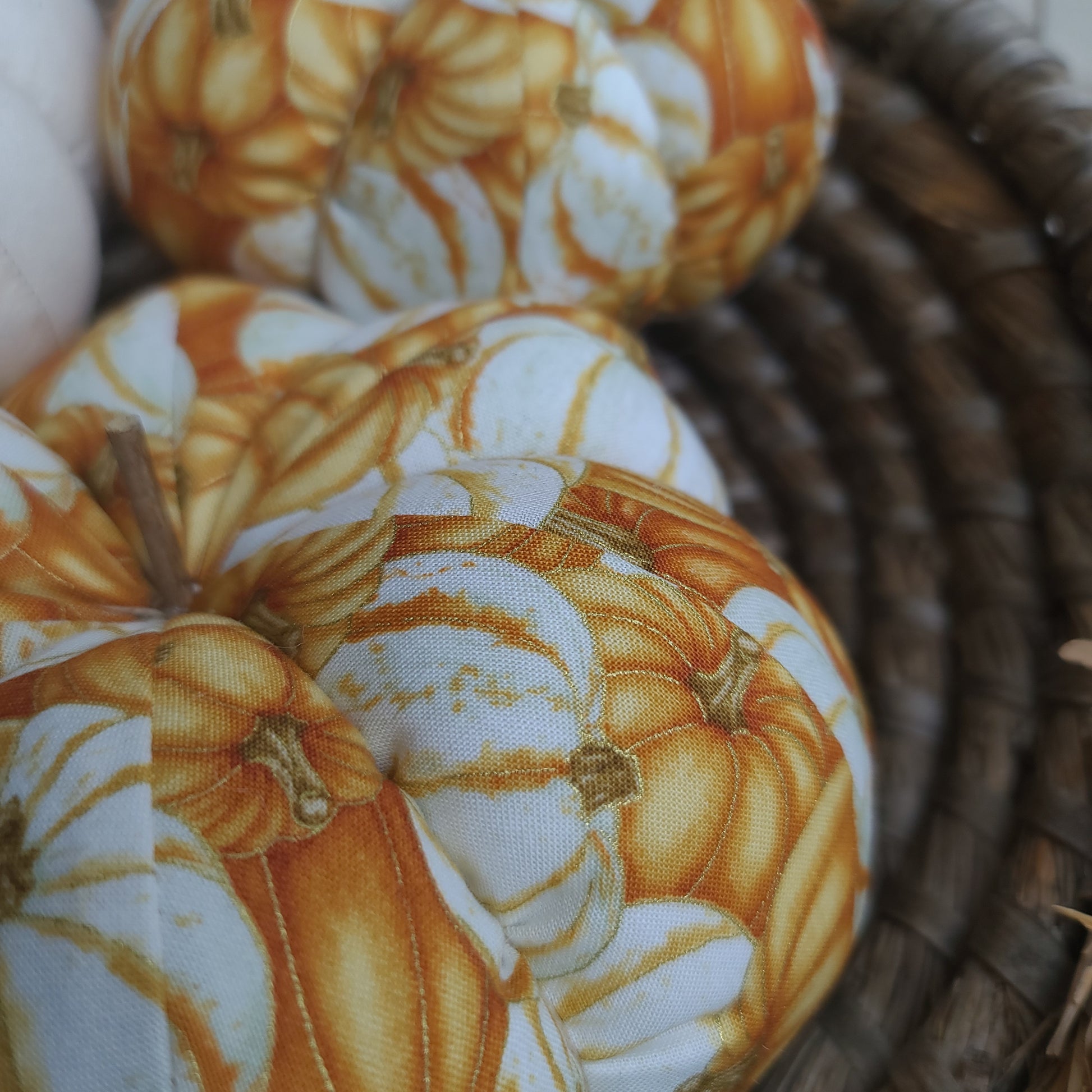 You'll receive a set of three pumpkins crafted from a rich gold and cream fabric: 1 large and 2 small.