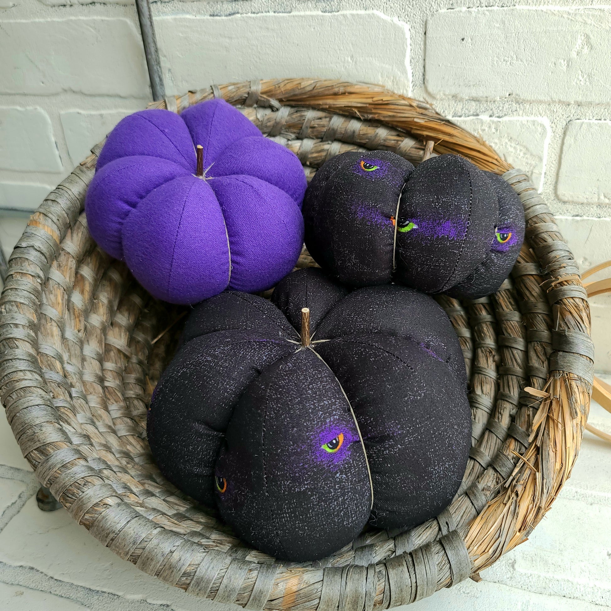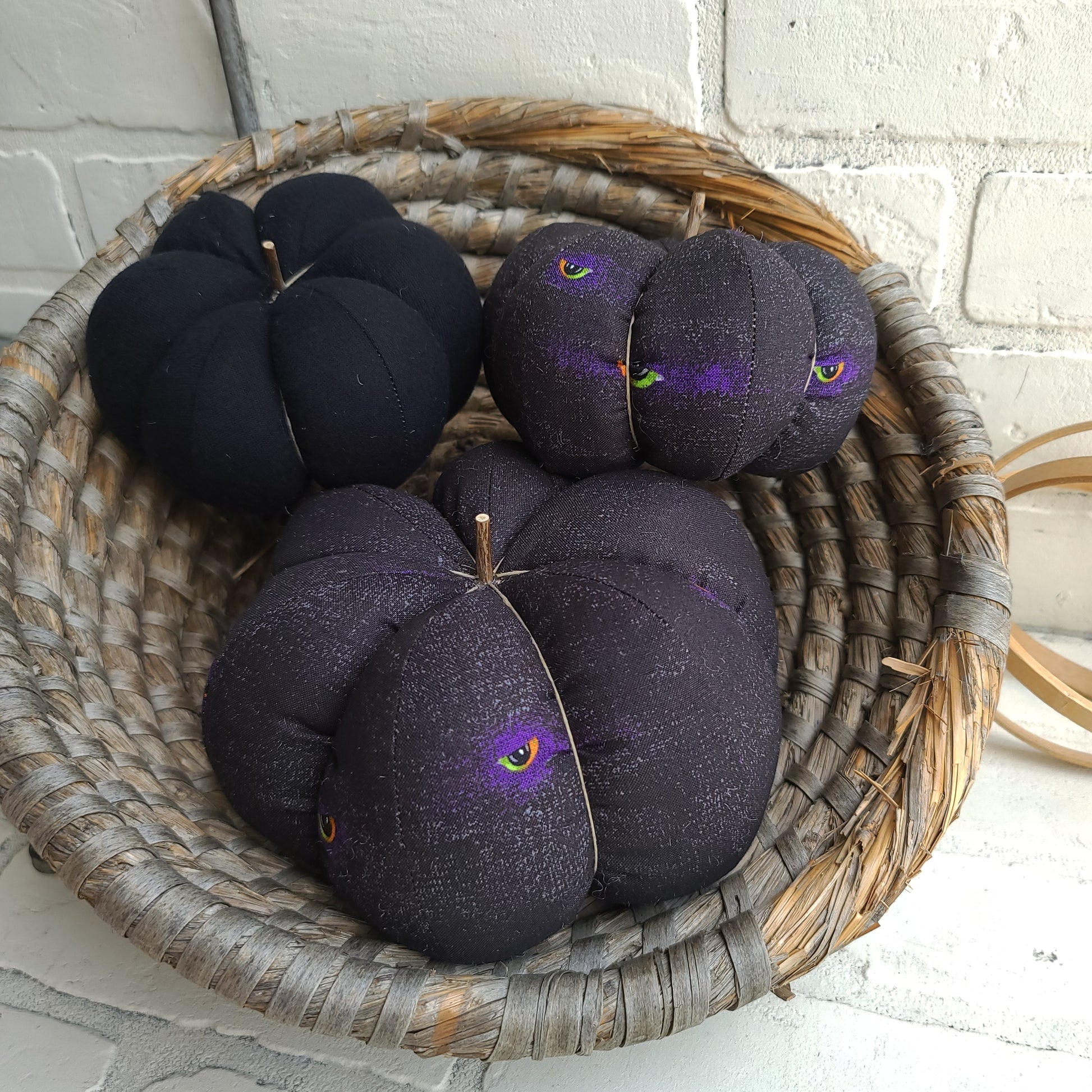 Skillfully created with soft cotton fabric, these Halloween Pumpkins are sewn together and filled with cotton polyfil to ensure a lifelike shape plus stylish appeal. This set of three includes a large & small Pumpkin featuring a festive Creepy Eye glow in the dark Fabric, as well as a small in a solid fabric of your choice. Each Pumpkin is artfully completed with a charming stem, making them ideal for decorating your autumn tablescape or porch basket.