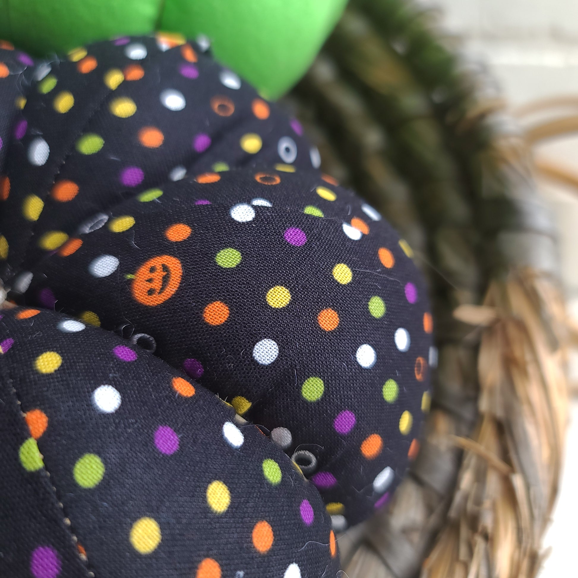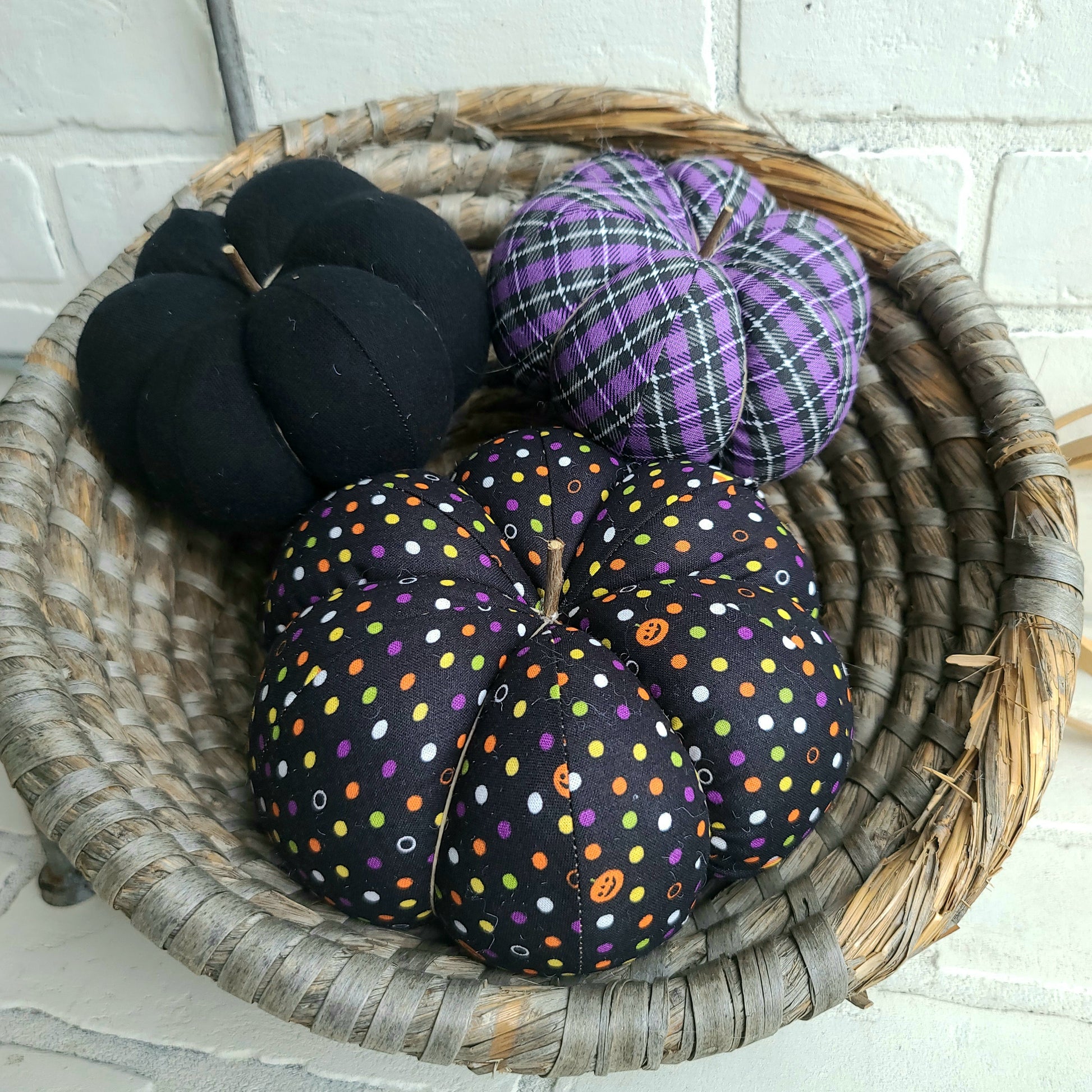 Skillfully created with soft cotton fabric, these Halloween Pumpkins are sewn together and filled with cotton polyfil to ensure a lifelike shape plus stylish appeal. This set of three includes a large Pumpkin featuring a festive Halloween polka dot pattern, as well as a small Purple plaid and a small Pumpkin in a solid fabric of your choice. Each Pumpkin is artfully completed with a charming stem, making them ideal for decorating your autumn tablescape or porch basket.