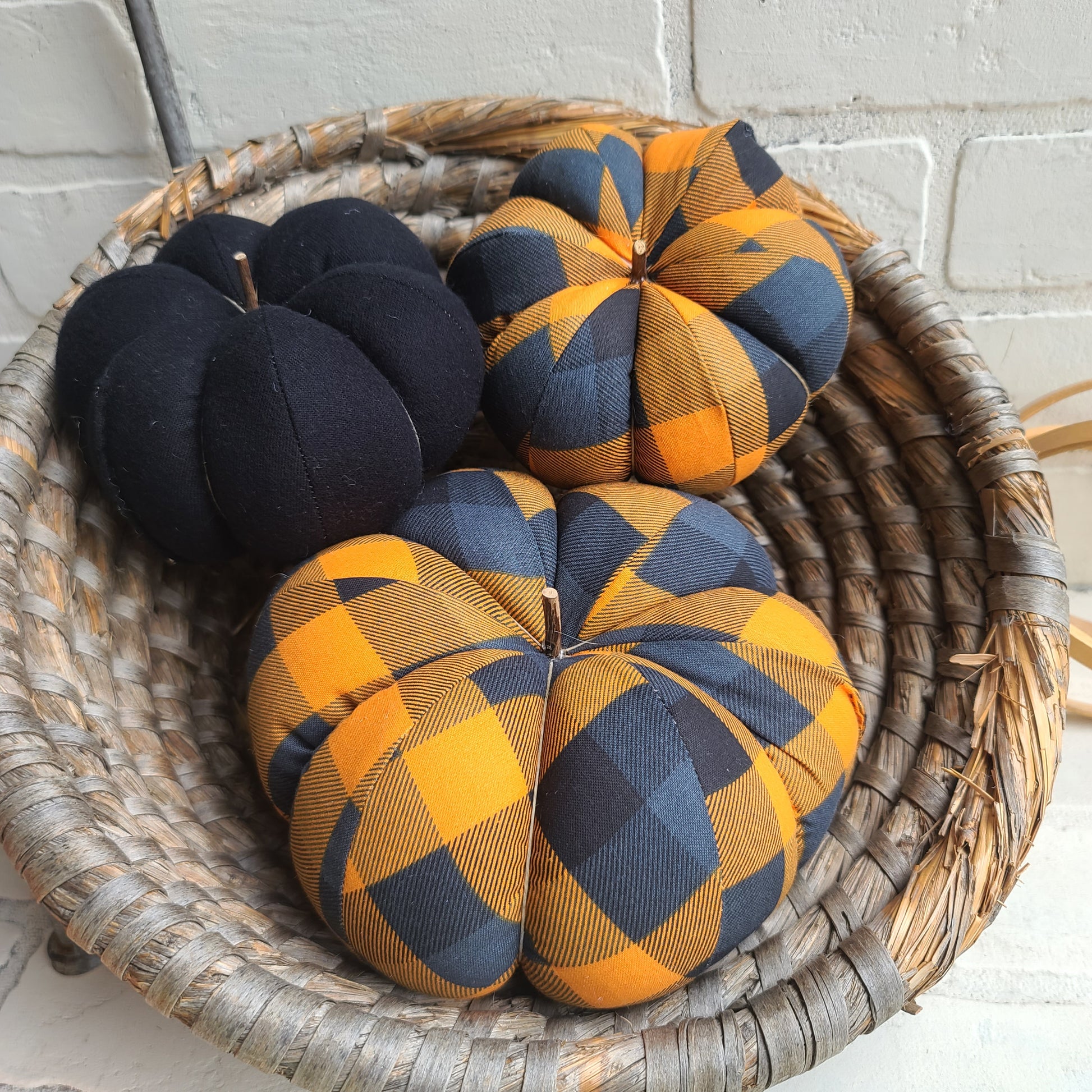 This Halloween set features a trio of Buffalo Plaid flannel pumpkins in orange, dark grey, and black, complete with a small solid accent pumpkin of your choice. In the set, you will receive one large and two small pumpkins.