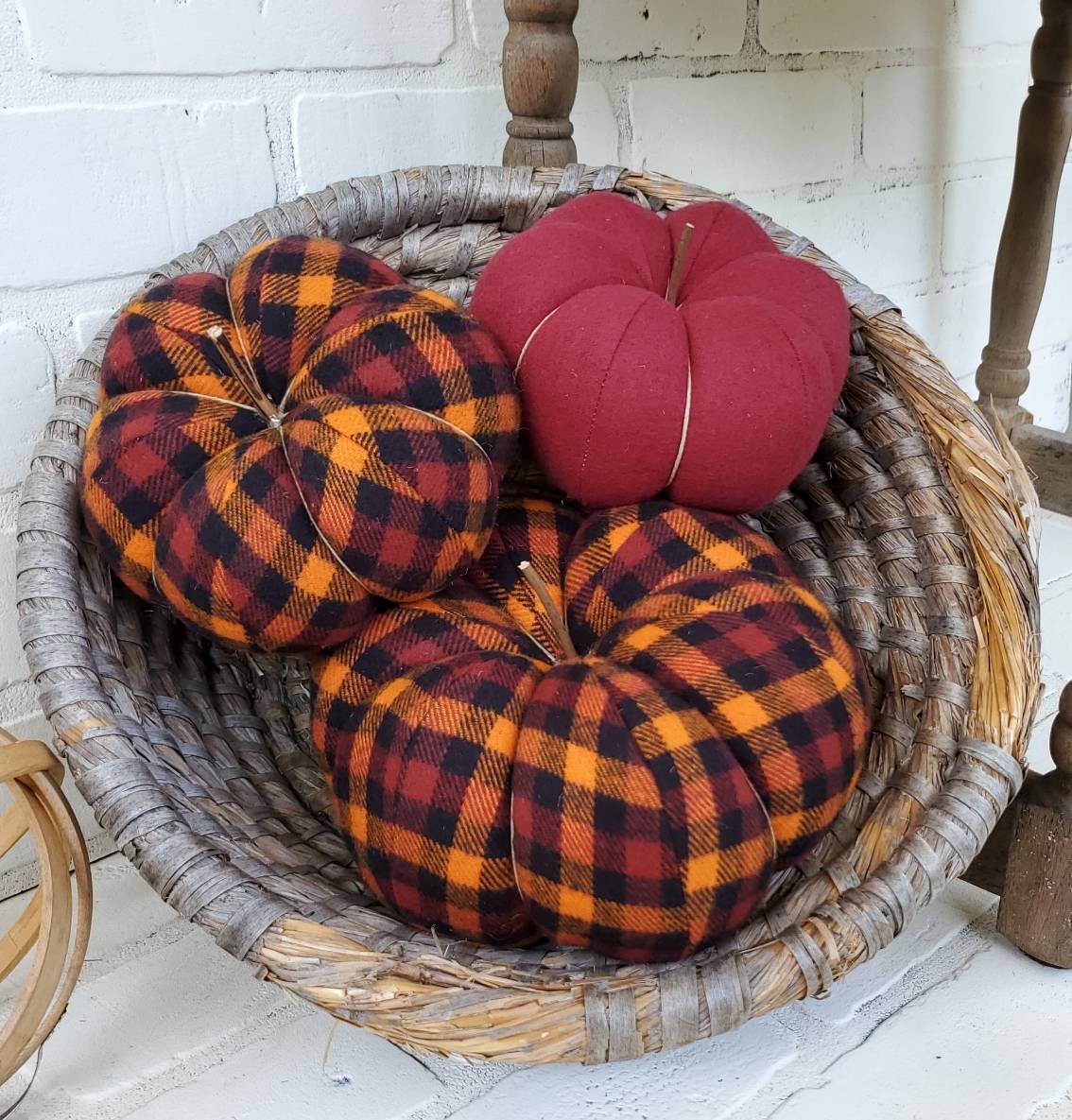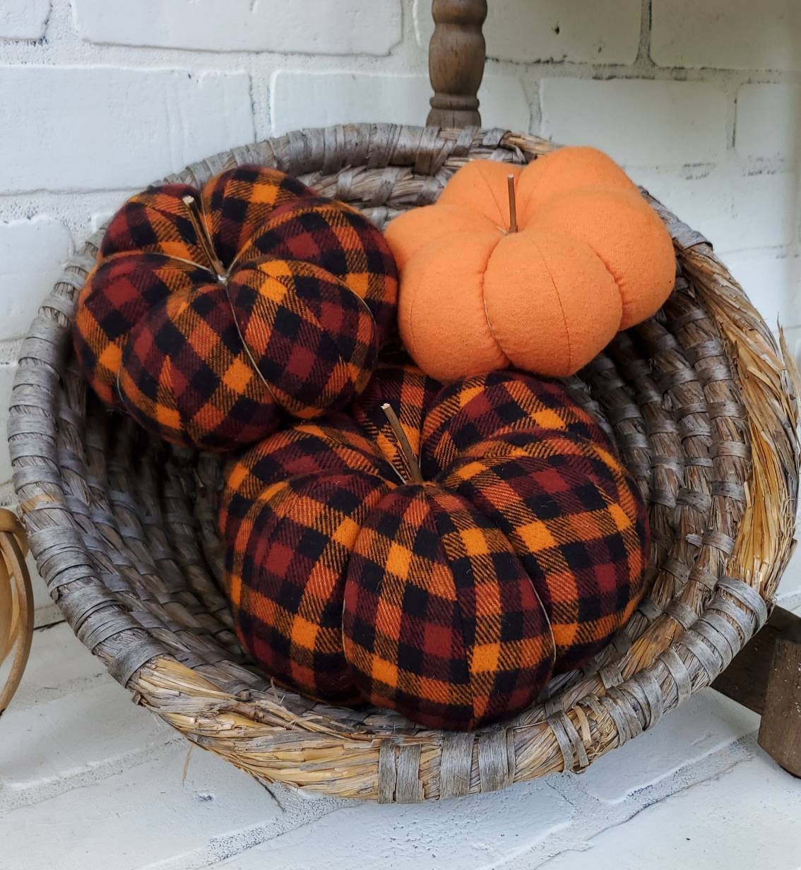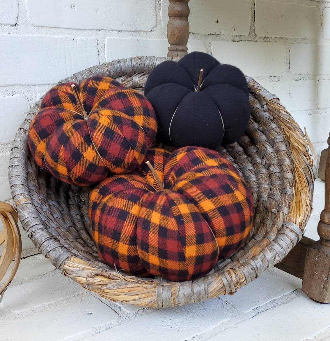 This set of fabric pumpkins is comprised of a Burnt Orange, Burgundy, and Black plaid pattern. You'll receive one Large and one Small plaid pumpkin with your choice of a solid-color pumpkin.