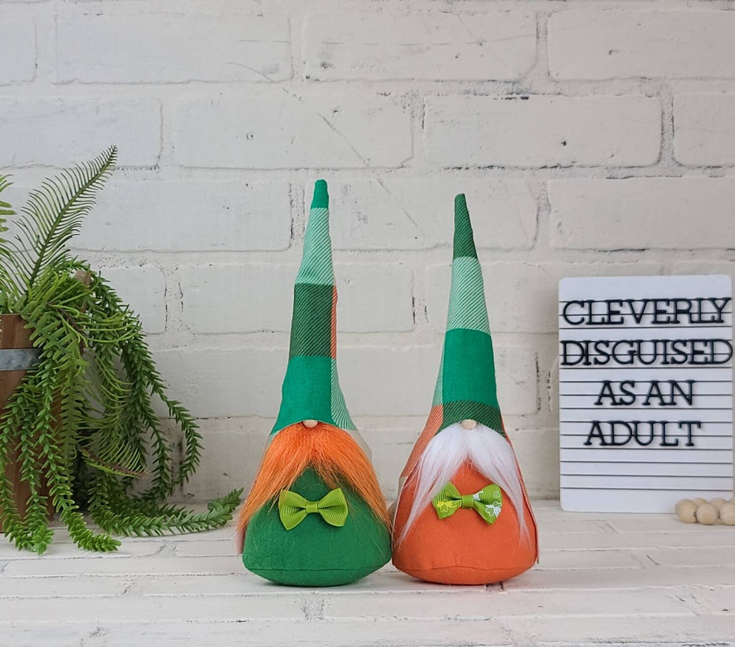 You'll receive one handcrafted Tomte, finished with an Irish plaid hat in Greens and Orange hues, made from your chosen body fabric. Each Gnome is filled with poly-fil for optimum softness and features a rice-filled base to ensure secure standing. Lastly each gnome is finished with a fur beard and wooden nose for a complete look.