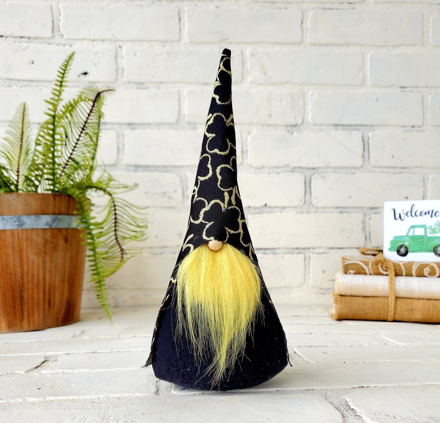 You'll receive one handcrafted Tomte, finished with Black hat accented with Gold glittery Shamrocks. With your choice of body color. Each Gnome is filled with poly-fil for optimum softness and features a rice-filled base to ensure secure standing. Lastly each gnome is finished with a fur beard and wooden nose for a complete look.