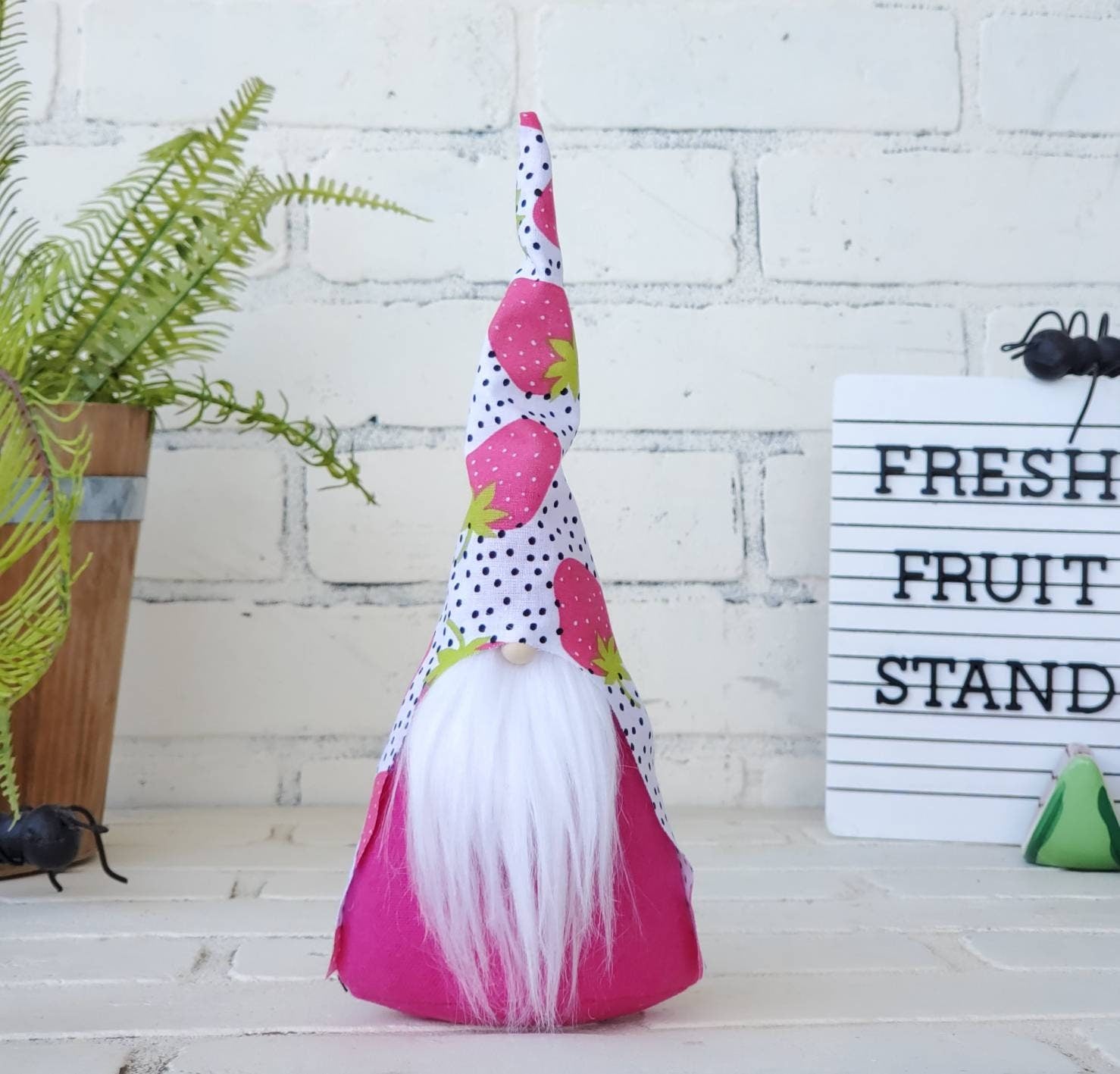 You'll receive one handcrafted Tomte, finished with Strawberry print hat, made from your chosen body fabric. Each Gnome is filled with poly-fil for optimum softness and features a rice-filled base to ensure secure standing. Lastly each gnome is finished with a fur beard and wooden nose for a complete look.